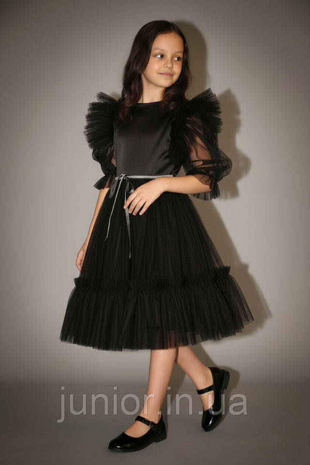 Пориньте у світ загадкової елегантності з нашим святковим платтям "Wednesday Addams" для дівчинки! Це чорне плаття, виконане в стилі улюбленої героїні, стане чудовим вибором для юних шанувальниць готичної естетики. Гладкий атлас у поєднанні з легкою та повітряною фатиновою спідницею створює витончений та водночас трохи містичний образ. Довгі рукави додають сукні особливої елегантності.