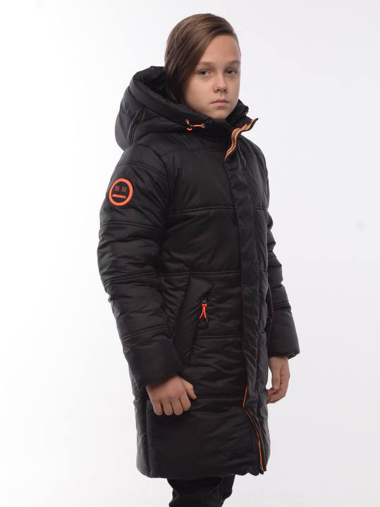 Підліткова зимова подовжена курточка на хлопчиків. Наповнювач синтепух легкий і гіпоалергенний, витримує холод до -25 °C. Силует прямий. М'які в'язані манжети по низу рукавів для комфорту і захисту від холоду. Капюшон регулюються кулісою. Дві кишені на блискавці. Застібка на блискавку з планкою на кнопках.