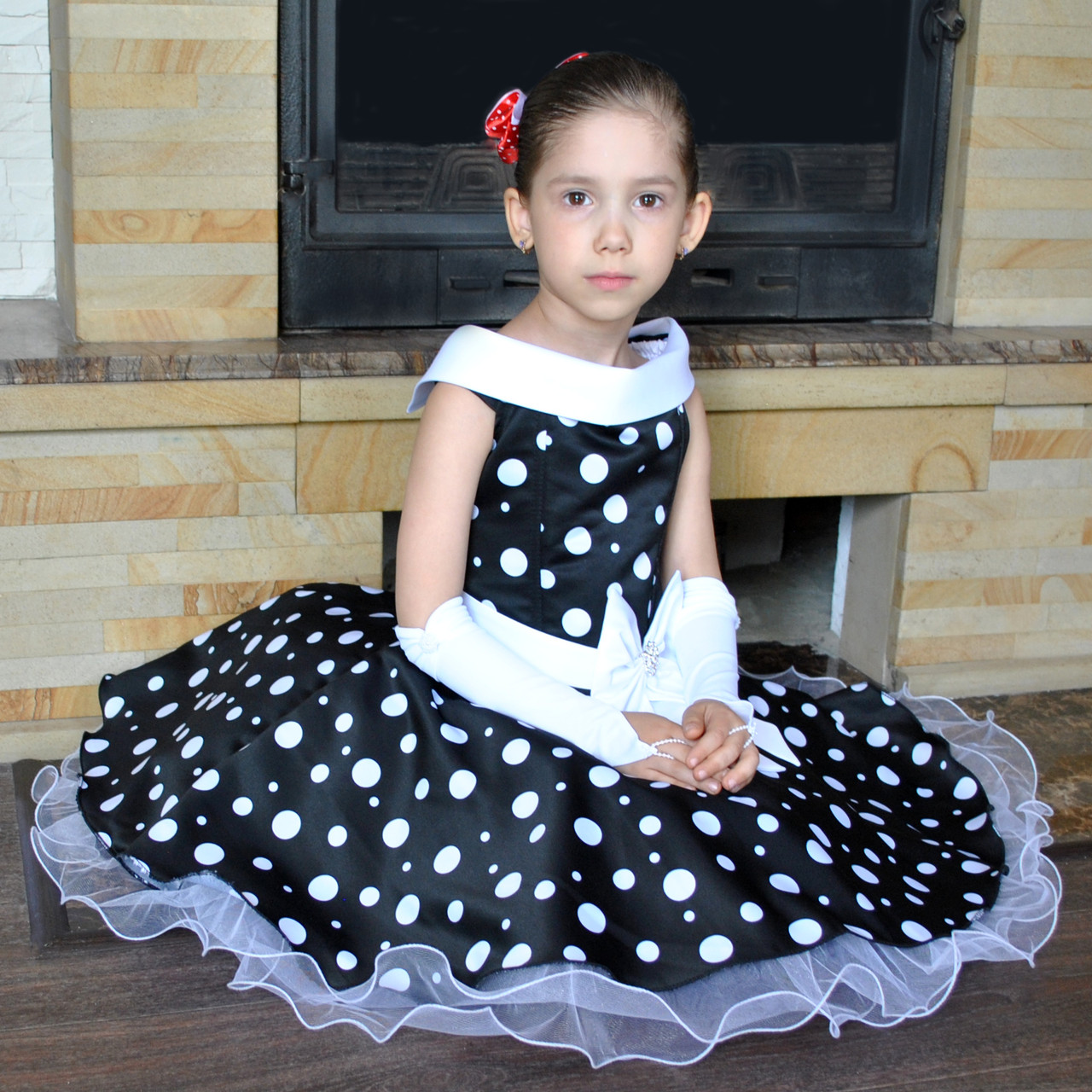 Ошатний плаття в горох для дівчинки.Стиляги.Ззаду корсет на блискавці та шнурівці. Пояс із бантом.Прикрашений стразами та намистинами.Плаття має 5 шарів тканини, що робить його дуже пишним.Прекрасно тримає форму, не мнеться.