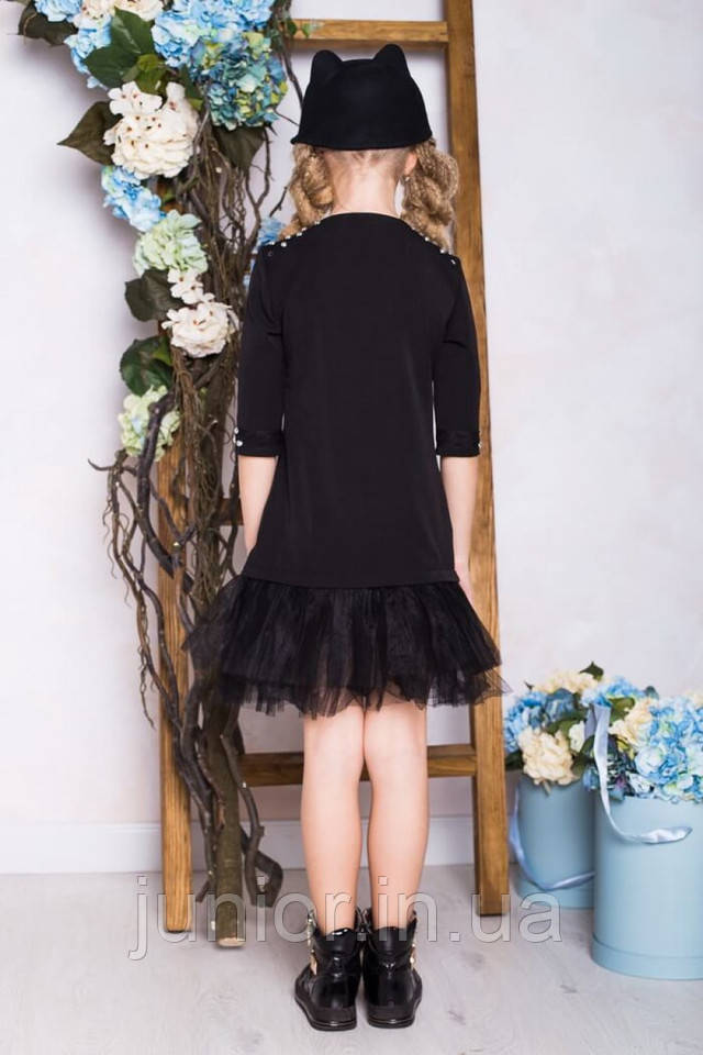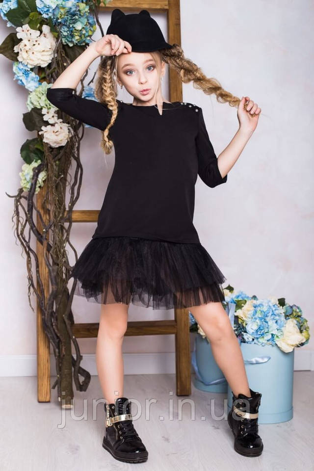 Вільний верх із напуском, виготовлений із костюмної тканини стрейч-тіар, має незвичайний вигляд у поєднанні з пишною багатошаровою спідницею з прозорого фатину, вшитою зсередини. Такий фасон підходить як худі дівчаткам, так і маленьким пшеницям, оскільки чудово приховає зайві кілограми.